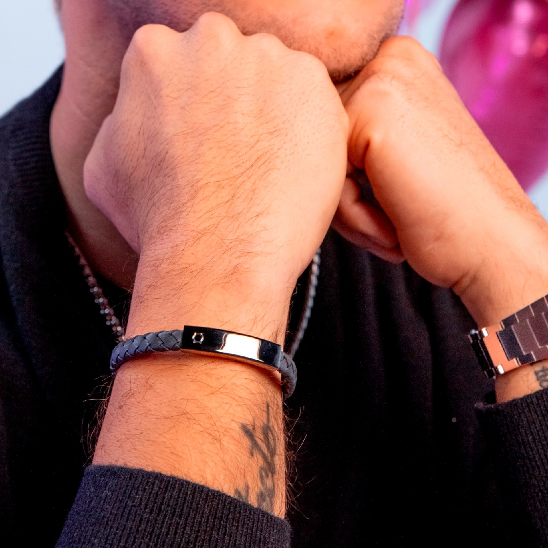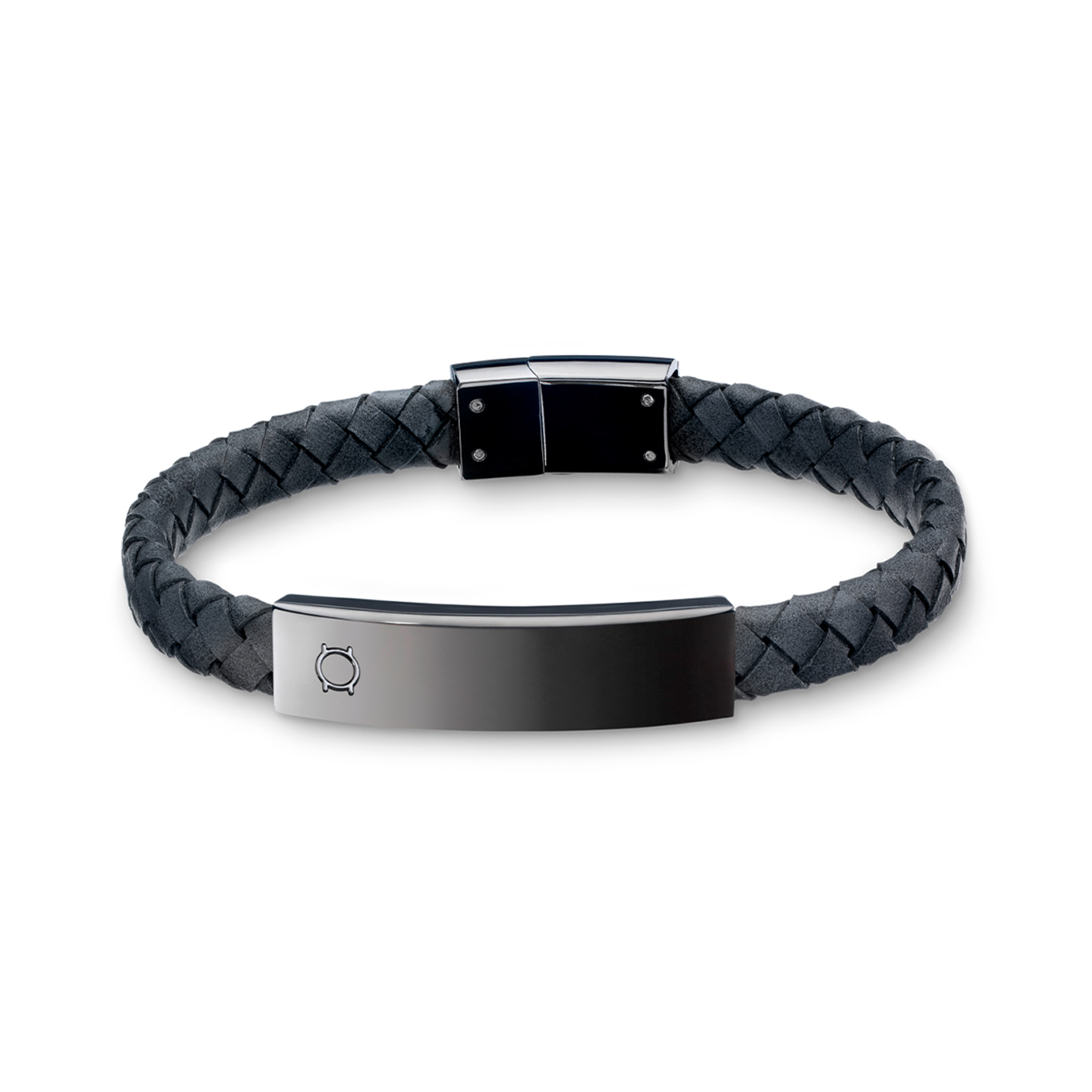 A pulseira Maven da coleção One Men é composta por uma trança em pele cinzenta com uma barra de metal prateado e um fecho de encaixe magnético também em prateado gun. O acabamento brilhante do metal contrasta com a textura mais fosca da pele dando à pulseira um toque mais edgy.