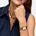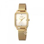 O relógio analógico Charmy Gold é uma peça delicada e feminina, com um design elegante e harmonioso. A caixa quadrada dourada envolve um mostrador em madrepérola, onde quatro cristais zircónicos brancos marcam as horas, acrescentando um brilho subtil. Os três ponteiros dourados (horas, minutos e segundos) destacam-se sobre o fundo claro, garantindo uma leitura simples e sofisticada. A bracelete dourada em mesh envolve o pulso com conforto e leveza, reforçando o caráter refinado do modelo. Como detalhe distintivo, apresenta um pequeno pendente em forma de coração, também em dourado, cravado com cristais zircónicos brancos, que acrescenta um toque romântico ao conjunto. Ideal para quem valoriza detalhes românticos num relógio feminino de acabamento dourado.