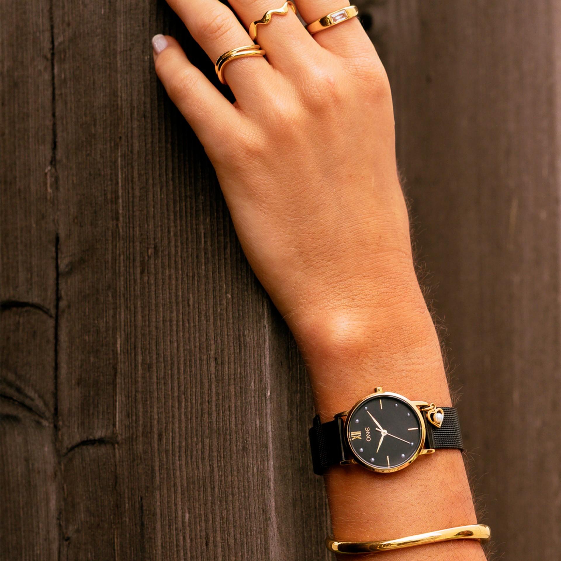O relógio analógico Truly Black é uma peça delicada e romântica que segue a tendência de caixas redondas mais pequenas no pulso.