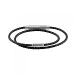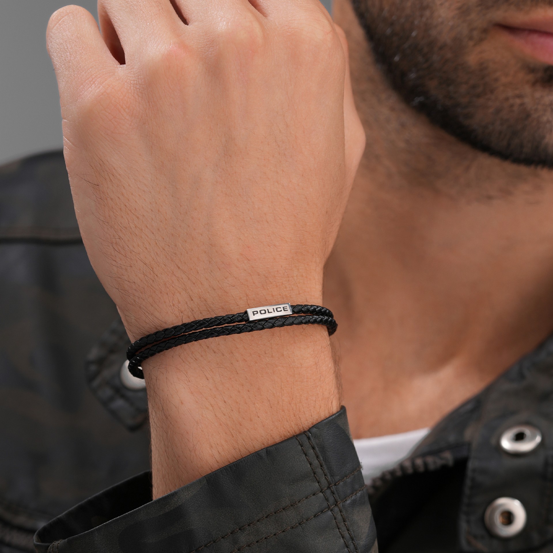 O Duplex explora texturas e versatilidade, sendo uma pulseira de couro preto de dupla volta, fechada com fecho magnético. Exibe a assinatura POLICE no centro, ideal para o desbravador moderno.